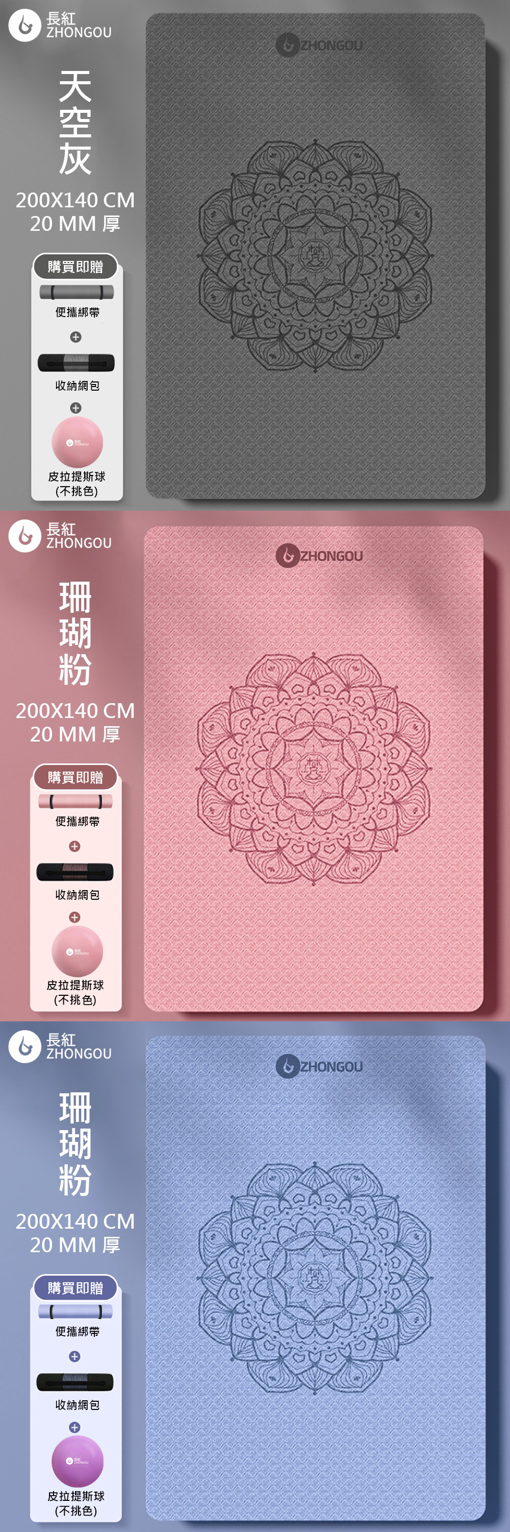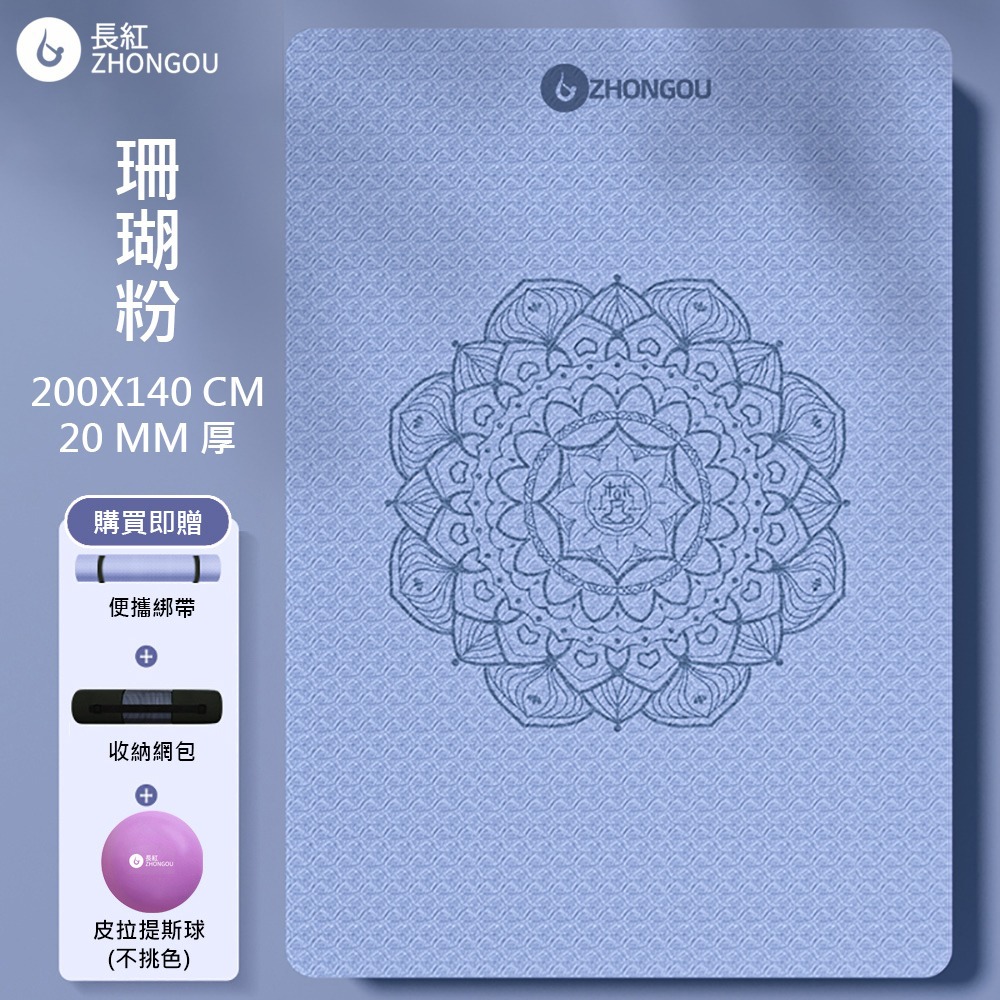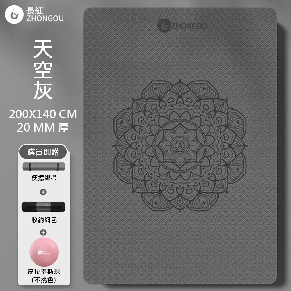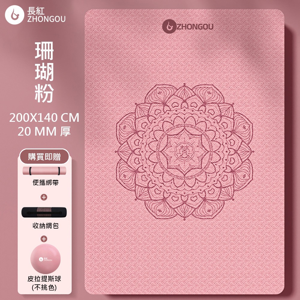 【TPE雙人款 買1送3】20MM厚 200×140CM 防滑加厚 曼陀羅花瑜珈墊 TP201420 (贈綁帶、背袋、直徑25公分皮拉提斯球)